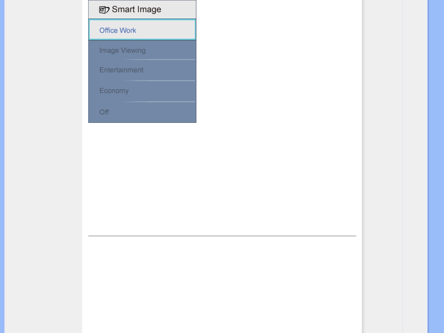 1. Office Work (Lavoro d'ufficio):Migliora il testo ed attenua la luminosità per migliorare la leggibilità e ridurre l'affaticamento degli